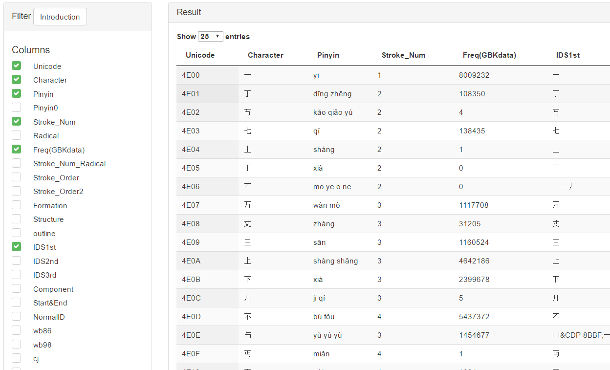 The database contains various information of more than 20,000 Chinese characters. You can filter, extract the characters on any rule as your need, and then download them.